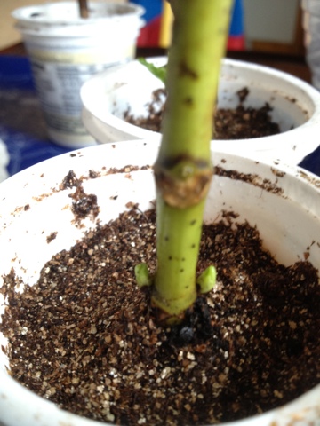 I have 6 cuttings growing indoors. They were placed in an unheated room this winter. The rooted cutting was rooted in september of 2011. The thin stems were hardwood cuttings taken in november of 2011. The thicker cuttings were semi-hardwood cuttings taken in November of 2011. I checked for roots on these cuttings and none were visible at the time however we do see the buds on the stems beginning to show growth.